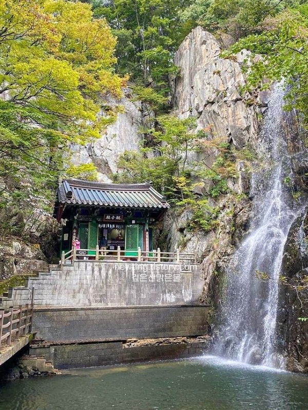 폭포 옆에 자리 잡은 작은 암자가 어우러진 이곳은 보는 것만으로도 가슴이 뻥 뚫리는 기분을 줍니다. 물줄기가 바위에 부딪히며 흩어지는 모습이 마치 하늘로 올라가는 용의 기운을 닮았다고 해서 이름 붙여졌는데, 햇살이 비치면 물안개 사이로 무지개가 피어올라 환상적인 장면을 연출하더라고요.